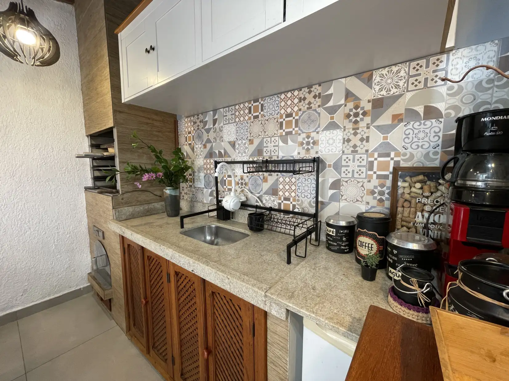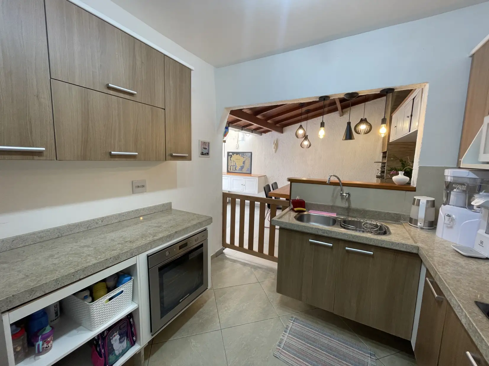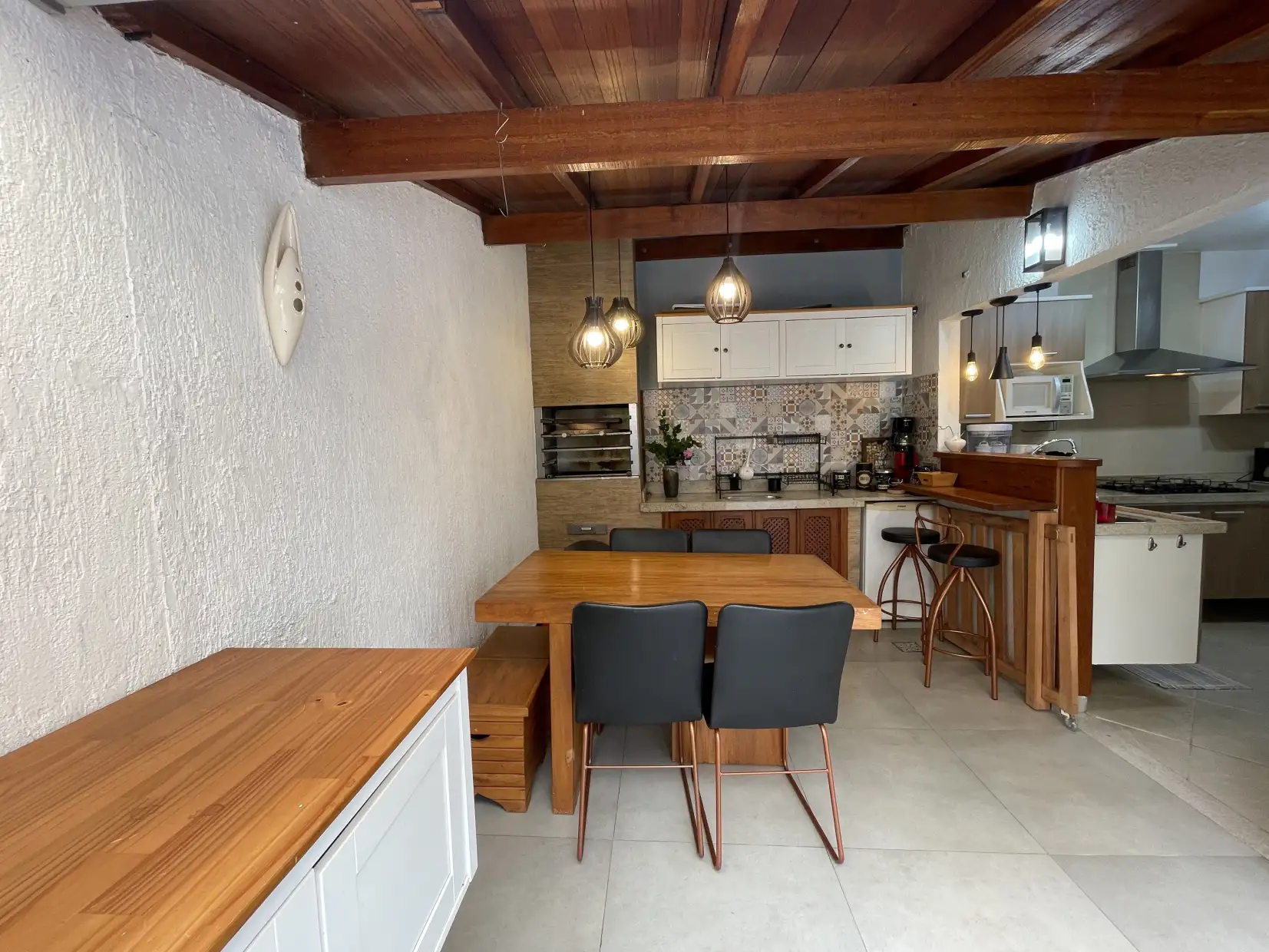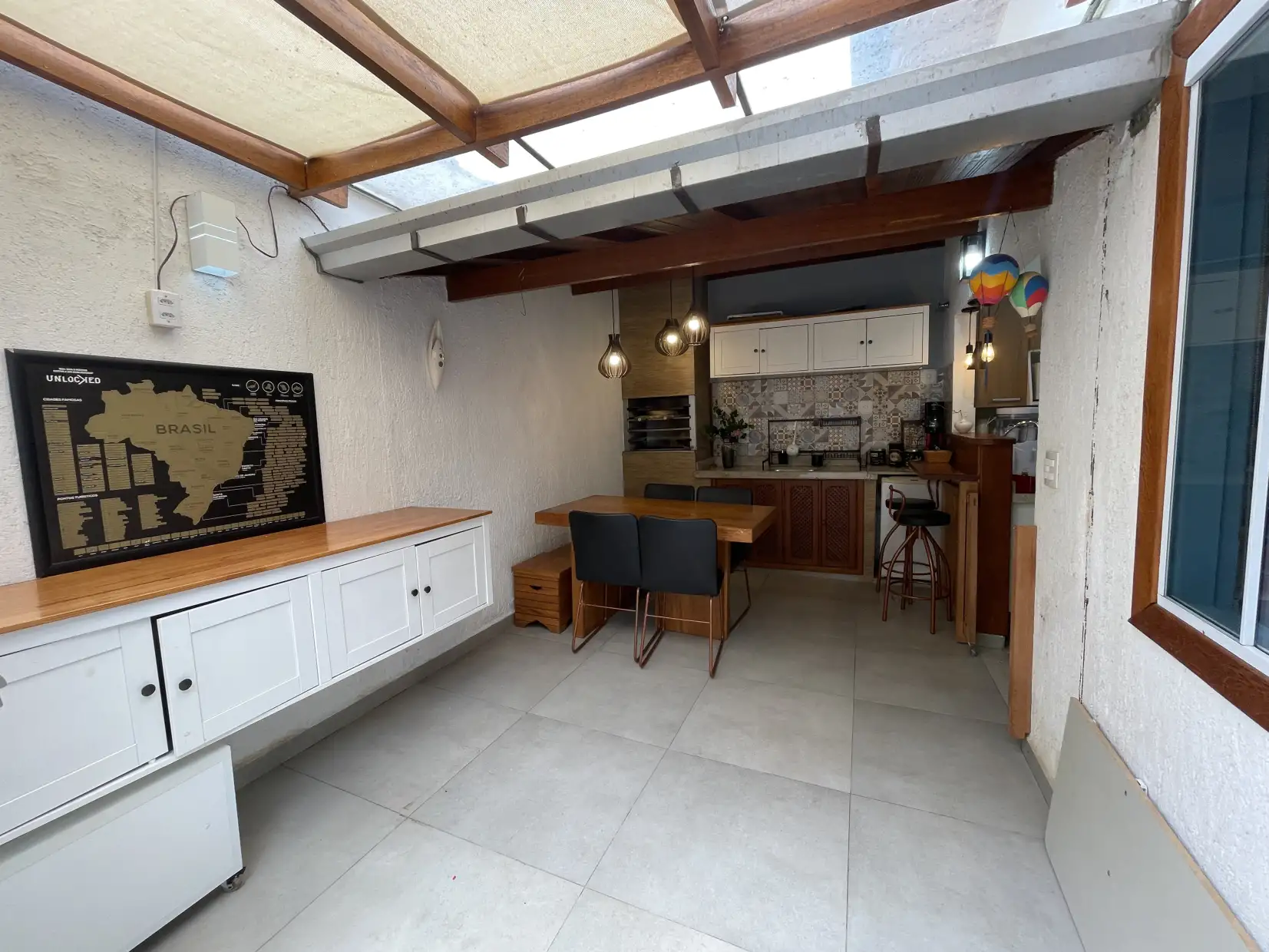 A copa/cozinha possui armários modulados e bancadas em granito, com integração ao espaço gourmet coberto, proporcionando um ambiente extremamente confortável e ideal para reunir família e amigos. Na área externa, dispõe de espaço descoberto com ducha e lavanderia coberta.