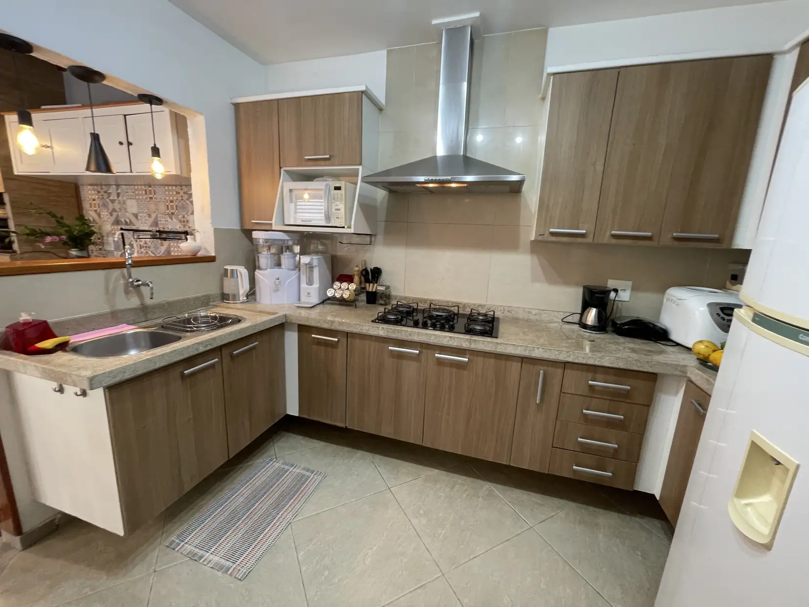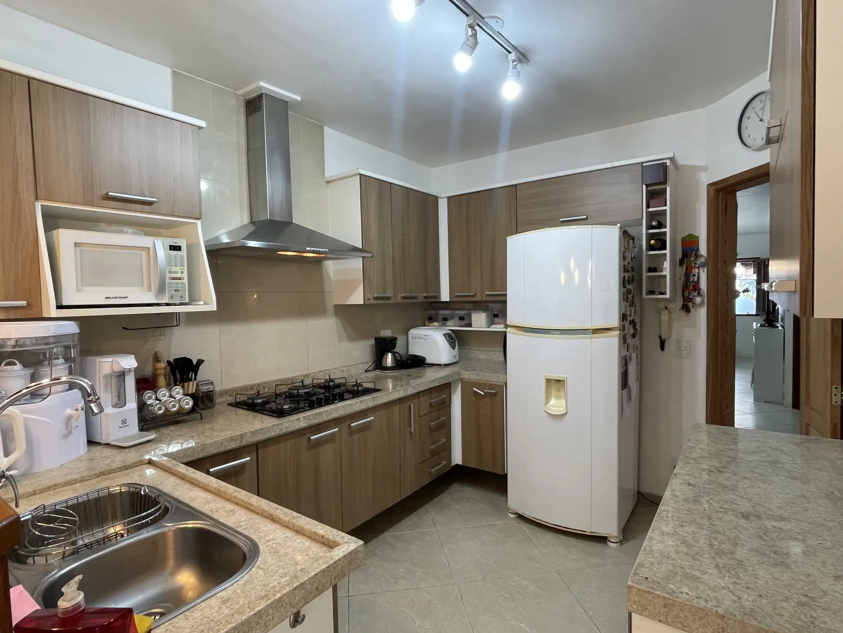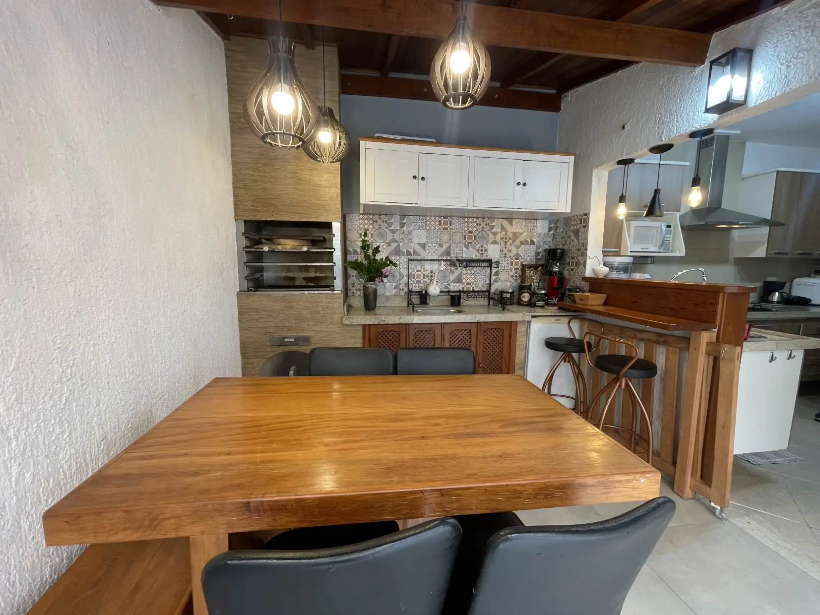 A copa/cozinha possui armários modulados e bancadas em granito, com integração ao espaço gourmet coberto, proporcionando um ambiente extremamente confortável e ideal para reunir família e amigos. Na área externa, dispõe de espaço descoberto com ducha e lavanderia coberta.