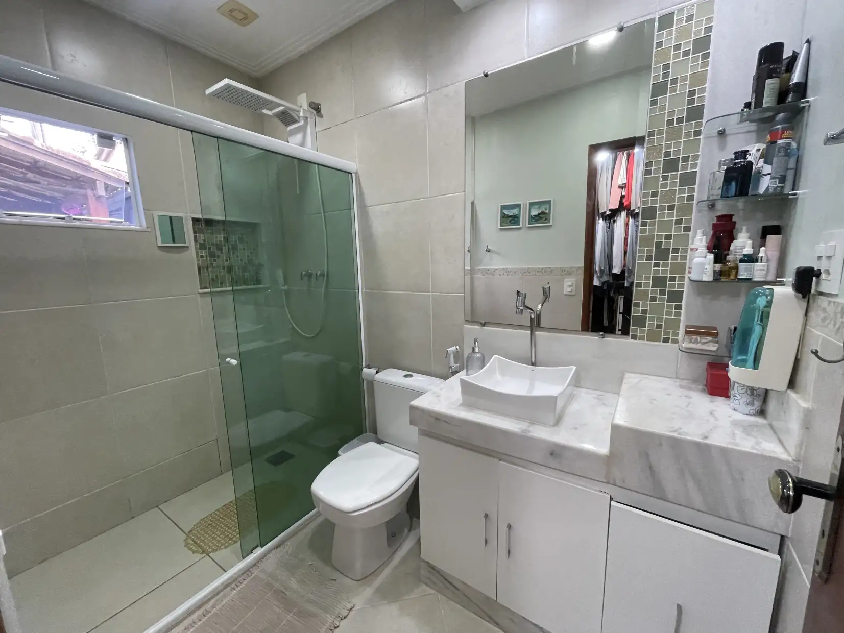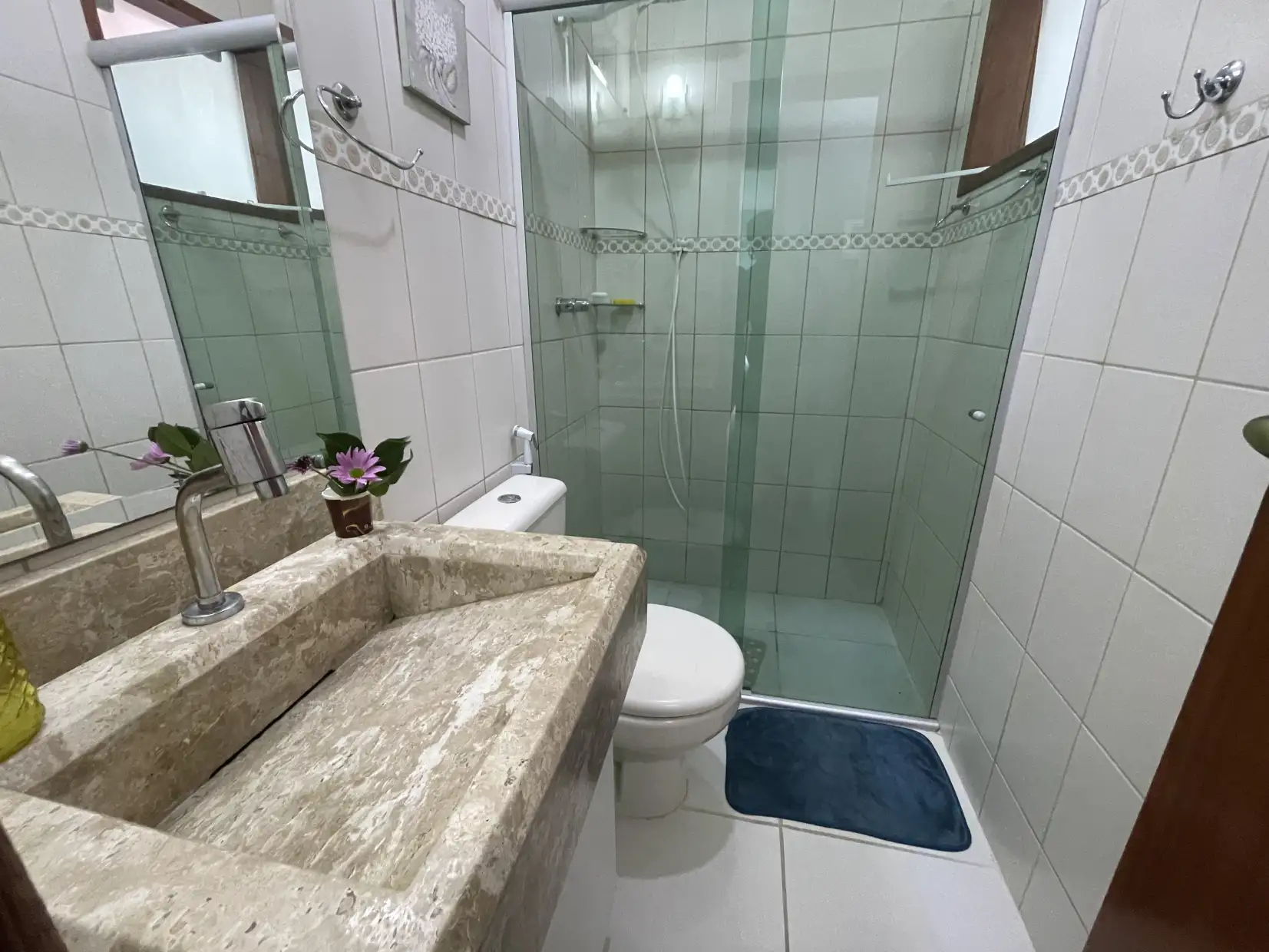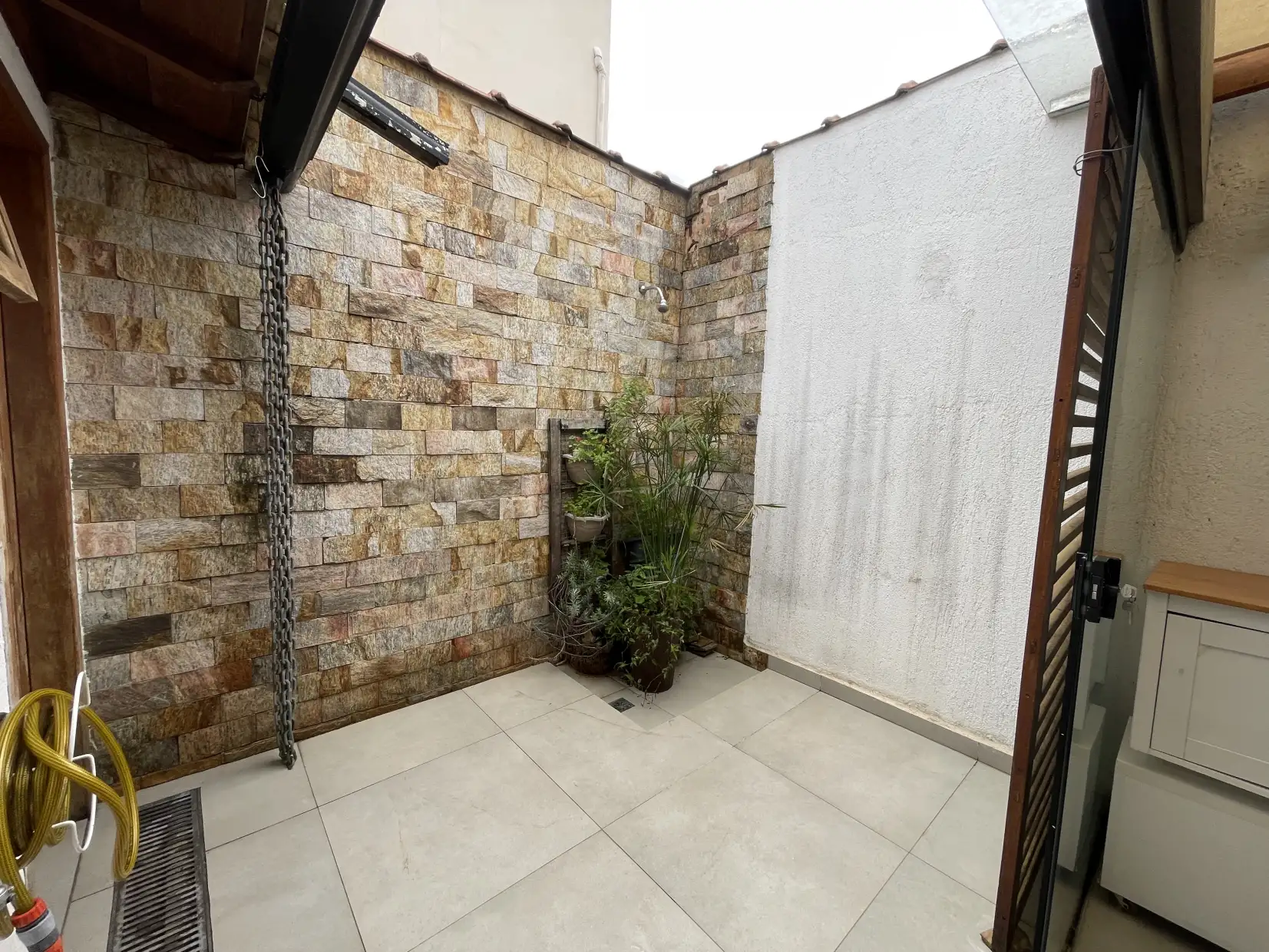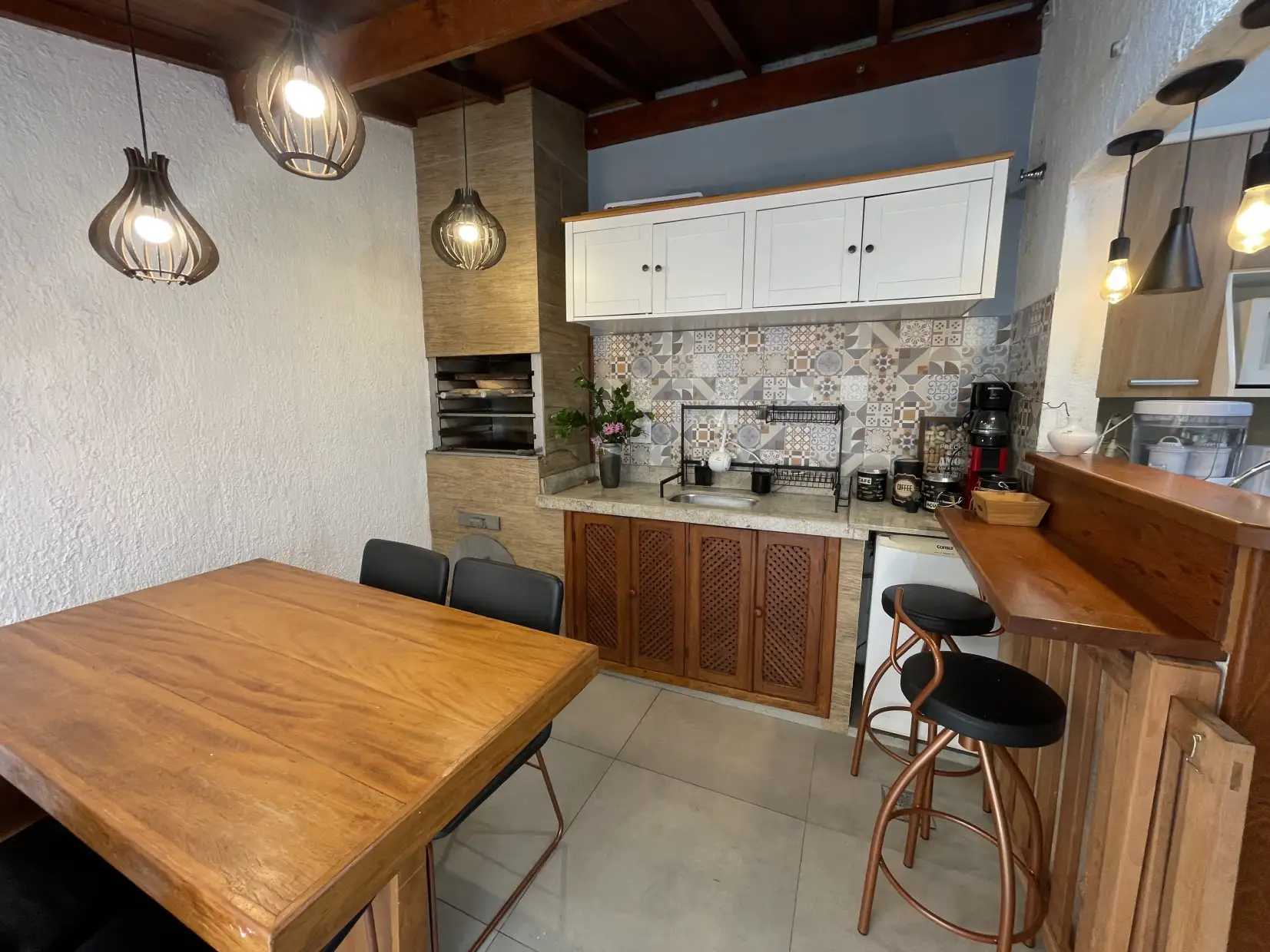 A copa/cozinha possui armários modulados e bancadas em granito, com integração ao espaço gourmet coberto, proporcionando um ambiente extremamente confortável e ideal para reunir família e amigos. Na área externa, dispõe de espaço descoberto com ducha e lavanderia coberta.