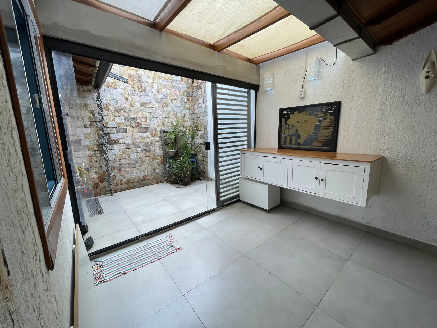 O imóvel é composto por belo jardim frontal, garagem coberta para 01 carro, varanda, sala em 02 ambientes, com um 3º ambiente atualmente utilizado como escritório, podendo ser facilmente revertido para mais um quarto ou sala de TV. Conta ainda com distribuidor com armários modulados, 02 quartos, sendo 01 suíte com closet e jardim de inverno.